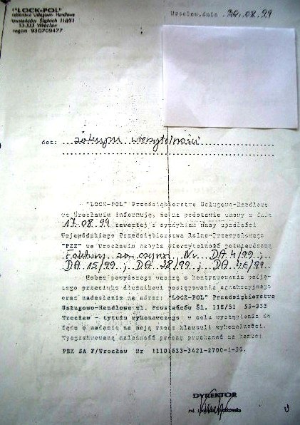Z umowy sprzedaży wierzytelności zawartej w dniu 99.08.17 pomiędzy Syndykiem masy upadłości Wojewódzkiego Przedsiębiorstwa Rolno – Przemysłowego „PZZ” we Wrocławiu , inż. Józef Kuczkowski wynika, że ‘zestaw’ wierzytelności na ogólną kwotę ok. 89,315 złotych nabyła Leokadia Kuczkowska, właściciel Przedsiębiorstwo Usługowo – Handlowe „LOCK – POL” za 0,6 % wartości. Prywatnie pani L. Kuczkowska jest żoną pana syndyka.