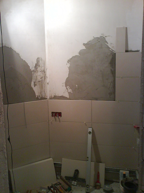 Rozkute miejsce trzeba było na nowo zamurować. Zamurowania dokonałem przy pomocy suchej zaprawy Goldband (prywatnie polecam – jest to wysokiej jakości mineralna masa, którą z łatwością można zamaskować nawet poważne ubytki, a dodatkowo przy odrobinie umiejętności można uzyskać całkiem gładką powierzchnię ściany – na posadzki się nie na nadaje!), na nią po wyschnięciu na drugi dzień nałożyłem dwukrotną warstwę unigruntu, a potem nakładałem zaprawę klejową do kafelków.